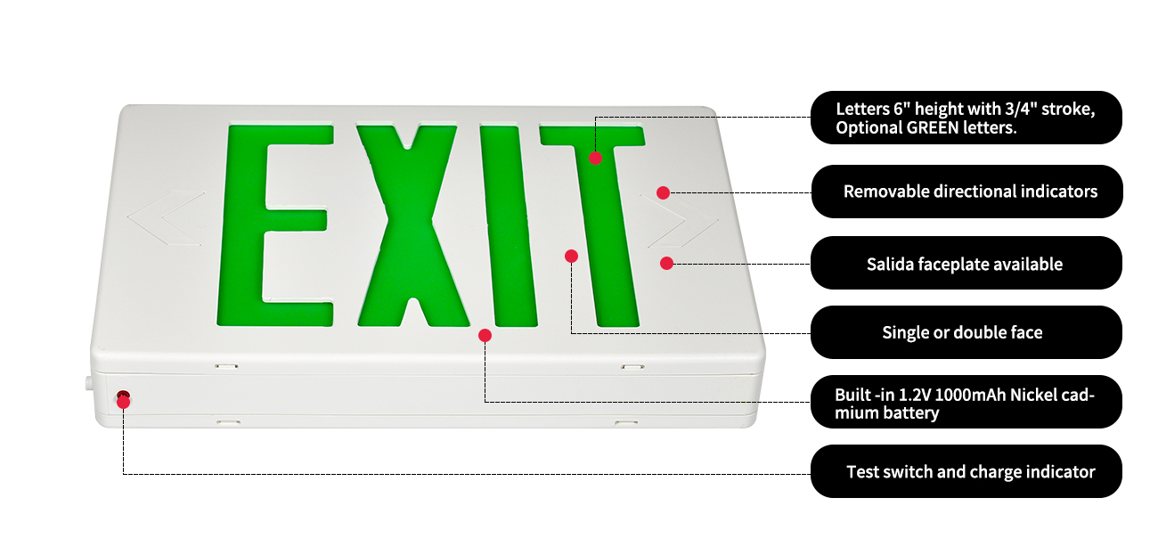 Egy egyszerű, hatékony és biztonságos UL felsorolt ​​kijárat 6 "-es zöld LED betűvel. Ez az egység 120 vagy 277 VAC működést igényel.