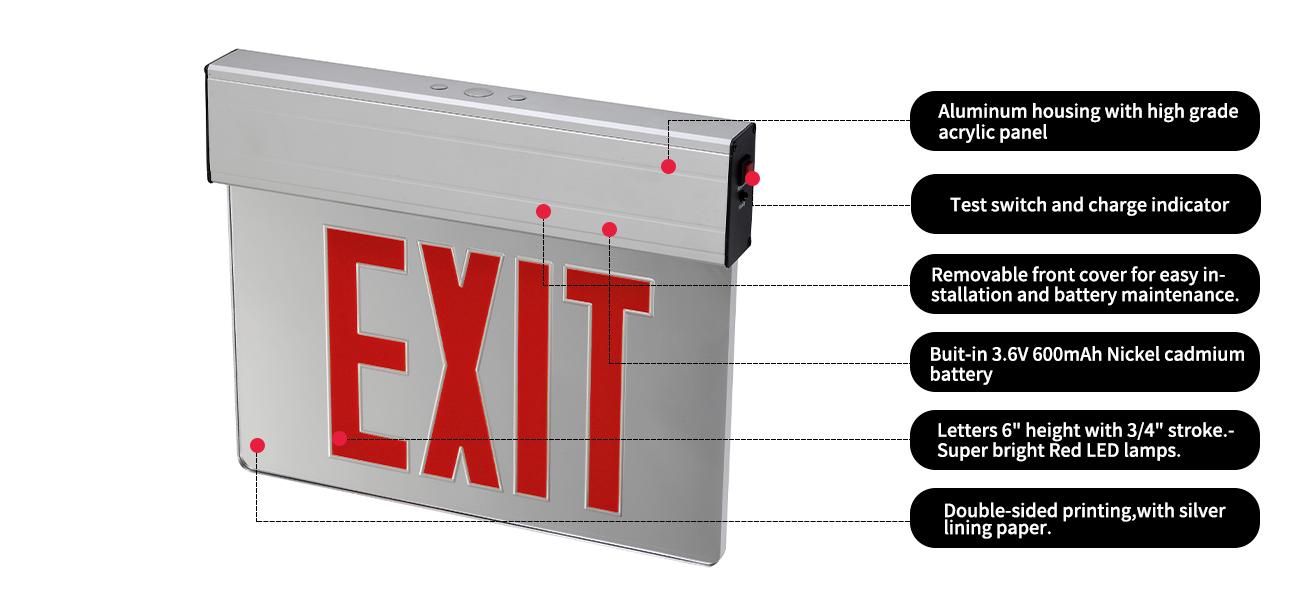 *Megvilágítás - Ez a Edge Lit Exit Sign sorozat hosszú élettartamú LED megvilágítást biztosít. Az egységet piros, nagy kimeneti LED -es táblával készítik.  Az energiafogyasztást kevesebb, mint 3 watt értékeljük az AC egyetlen modellegységnél. Az akkumulátor tartalék egységek energiafogyasztása kevesebb, mint 1 watt értékű.